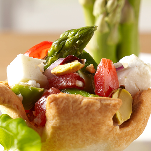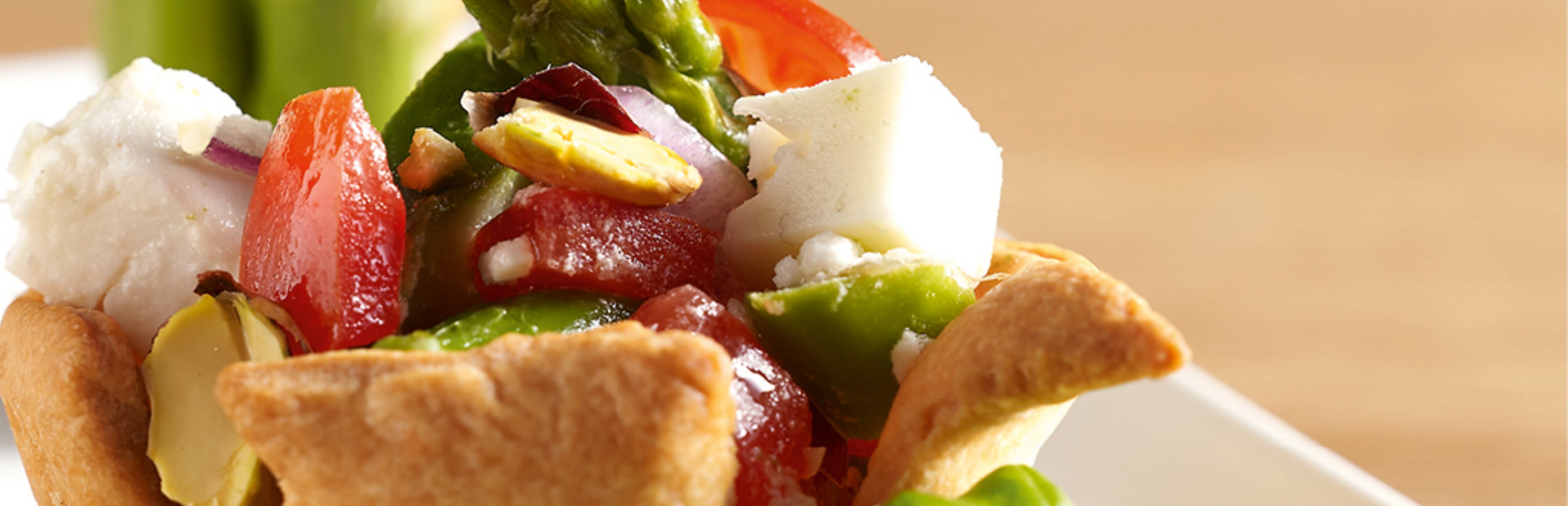 Die fertigen Blätterteigpasteten aus dem Ofen nehmen. Mit der Spinat-Tomatenmischung füllen, etwas Sauce darüber geben und mit Pinienkernen bestreuen.