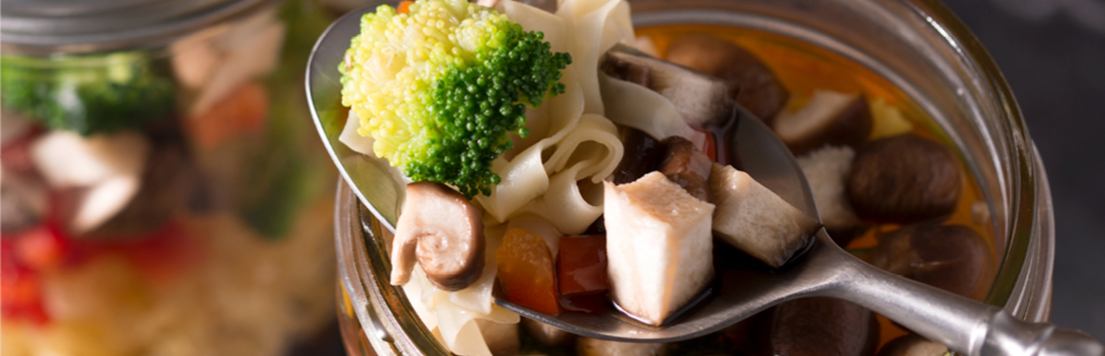 Wasser, Sojasauce, Salz, Zucker und Knoblauch aufkochen und etwas einkochen lassen. Den Brokkoli in kleine Röschen teilen und kurz blanchieren. Kohlrabi, Paprika, Frühlingslauch und Pilze klein schneiden. Alles in ein Weckglas schichten: 1. Sauce, 2. Nudeln, 3. Gemüse und als oberste Schicht die Pilze. Gut verschließen und mitnehmen. Wenn dann der Hunger kommt, mit kochendem Wasser übergießen – 2 Minuten ziehen lassen – fertig!