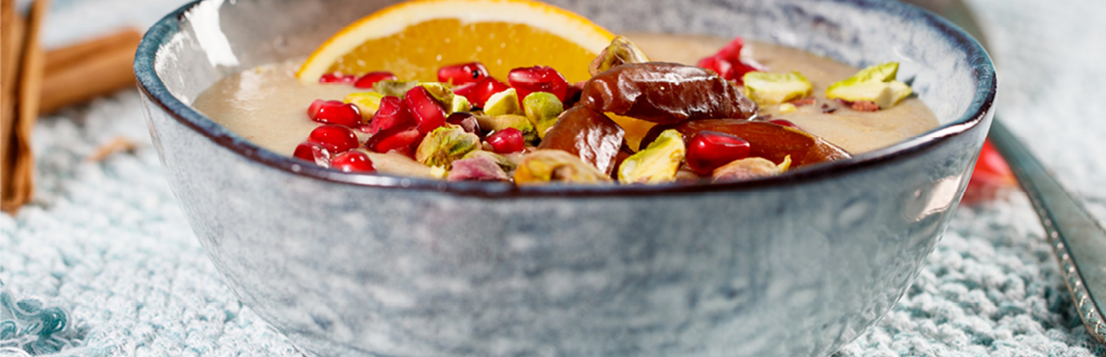 Den Grießbrei durchrühren und noch warm mit Granatapfelkernen, Pistazien, Orangenfilets und etwas Minze servieren.