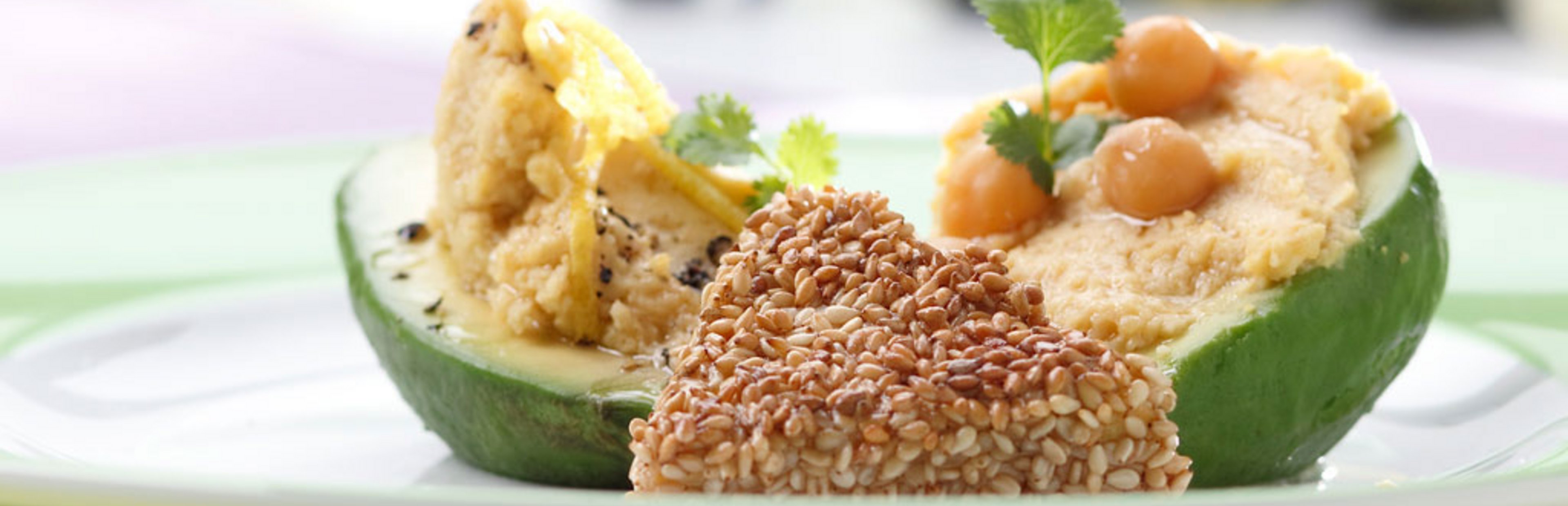 Avocados halbieren. Mit Salz, Pfeffer und gestoßenem Koriander würzen und mit etwas Zitronensaft einreiben. Mit Kichererbsenpüree gefüllt servieren.