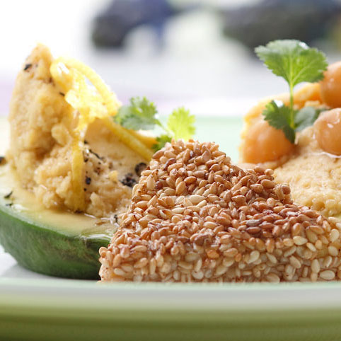 Die Tofuscheiben zuerst in Mehl, dann in Ei und Sesam wenden. Anschließend anbraten und würzen.