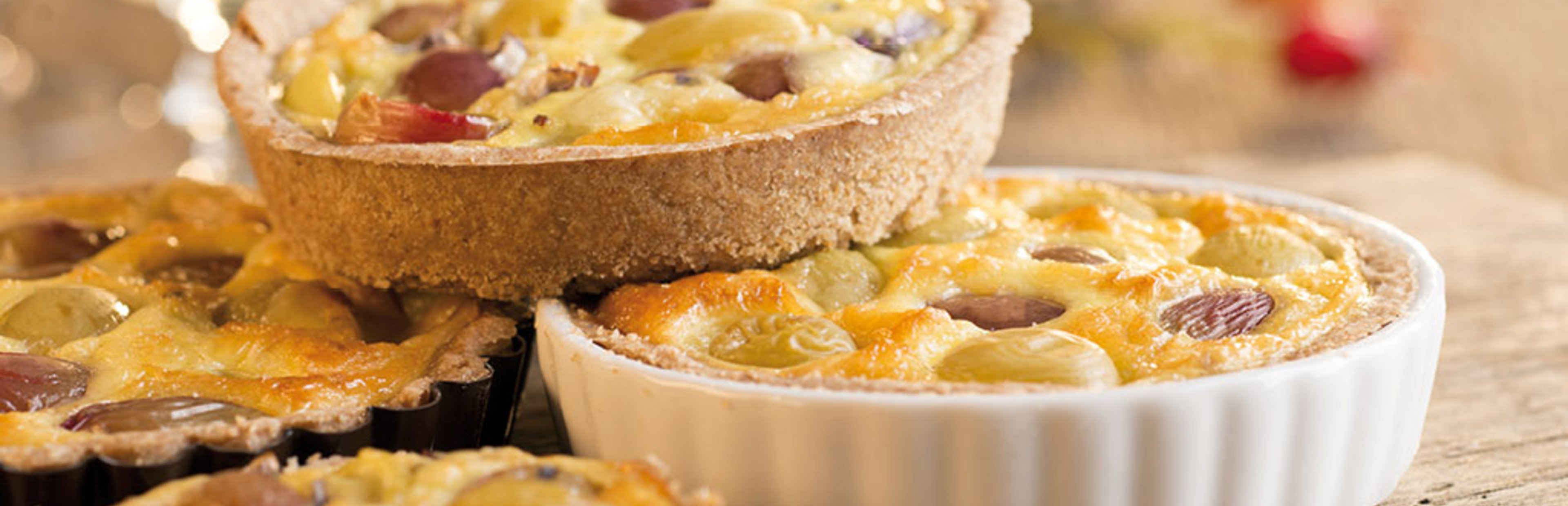 Anschließend ausrollen. Eine große Quicheform einfetten und mit dem Teig auskleiden. Die gehackten Zwiebeln in einer Pfanne in etwas Öl glasig dünsten und anschließend mit den Trauben auf den Quicheteig geben. Crème fraîche, Milch und Eier miteinander verrühren und mit den Gewürzen abschmecken. Den Käse raspeln und die Quiche damit bestreuen.
