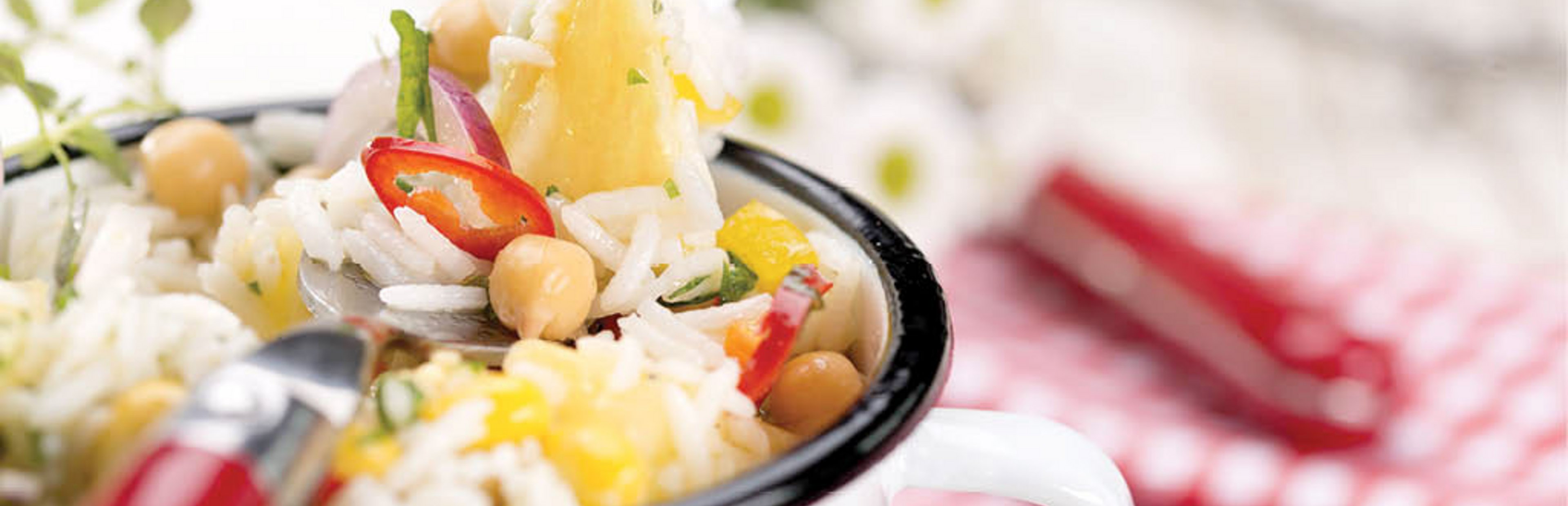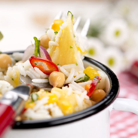 Alle übrigen Zutaten, gekochten Reis und das Dressing vermischen. Mit etwas Salz abschmecken.