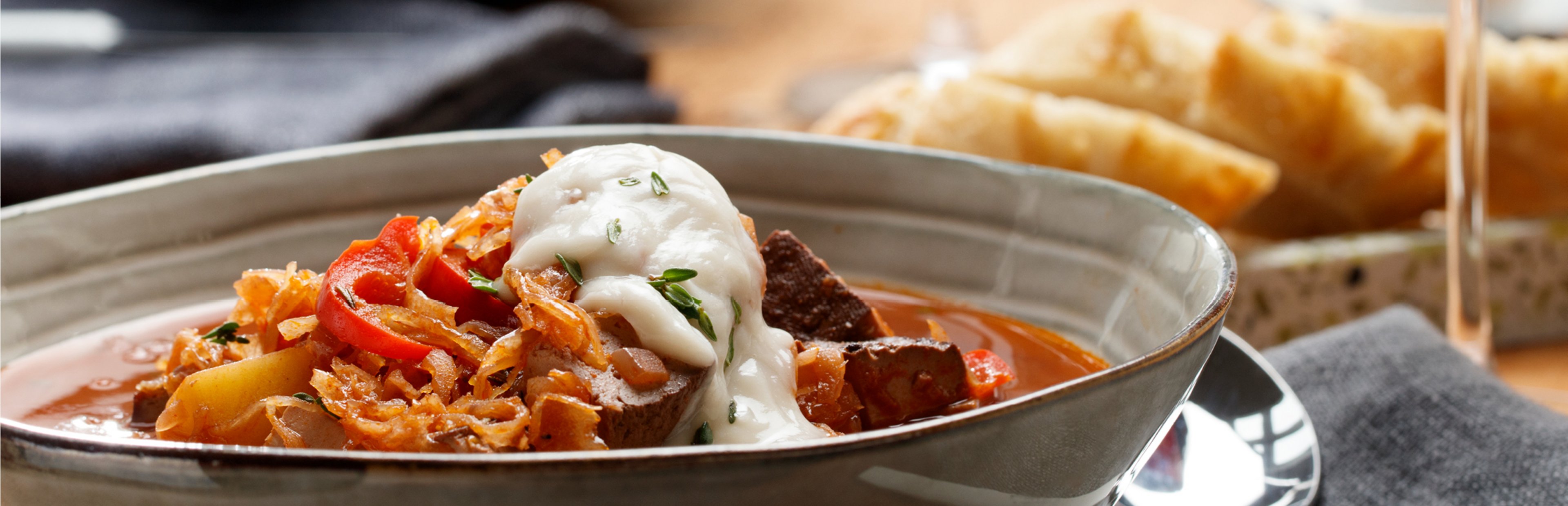 Dann mit Gemüsefond aufgießen. Senf, Paprikapulver und Sojasoße zugeben und aufkochen. Tofu, Paprika, Lorbeer und Thymianblättchen zugeben. So lange köcheln lassen, bis die Kartoffeln gar sind. Lorbeerblätter entfernen. Wenn nötig mit Speisestärke oder Soßenbinder binden. Sauerkraut abtropfen lassen und zum Gulasch geben. Mit Salz, Pfeffer und Zucker abschmecken. Mit etwas Haferjoghurt und Brot servieren.