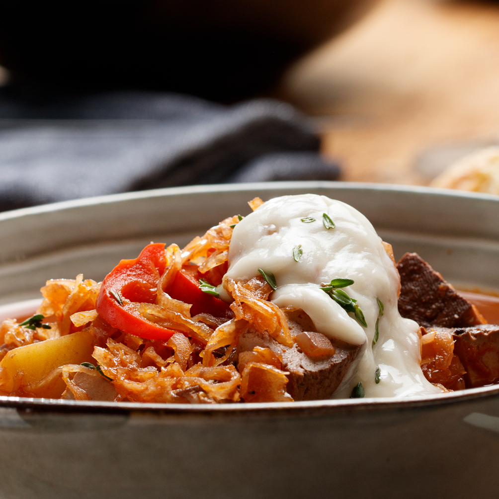 Veganes Gulasch mit Sauerkraut und Kartoffeln