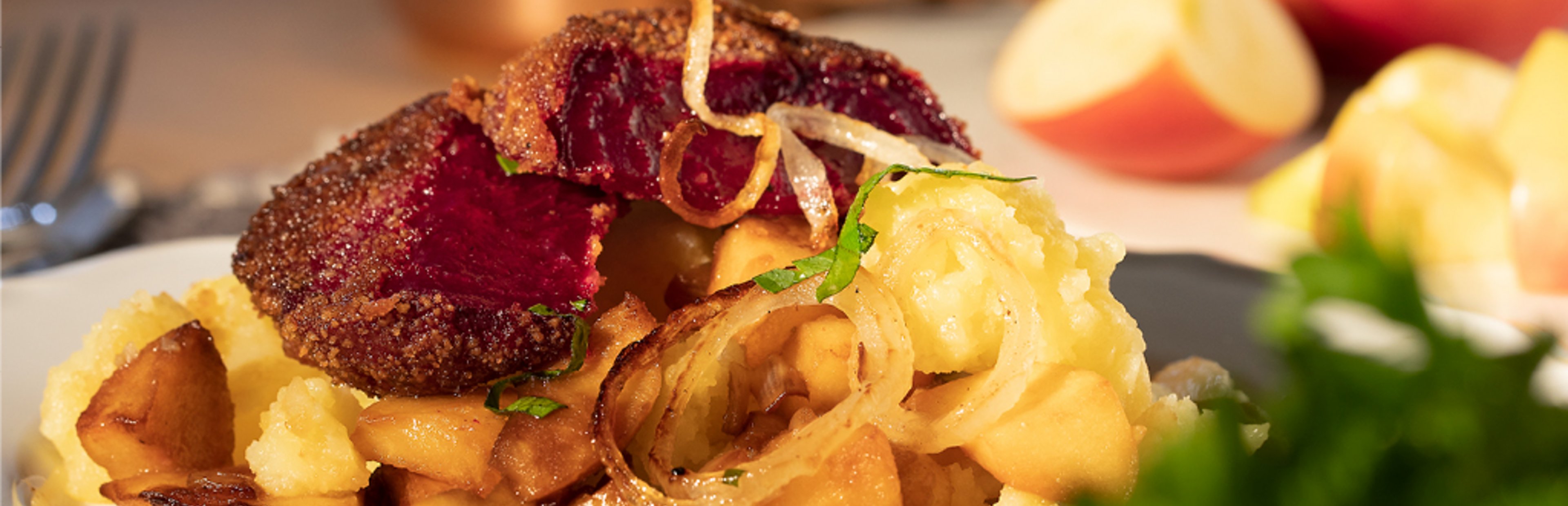 Das Kartoffel-Apfel-Püree mit gebratenen Rote Bete-Scheiben und den Röstzwiebeln servieren.