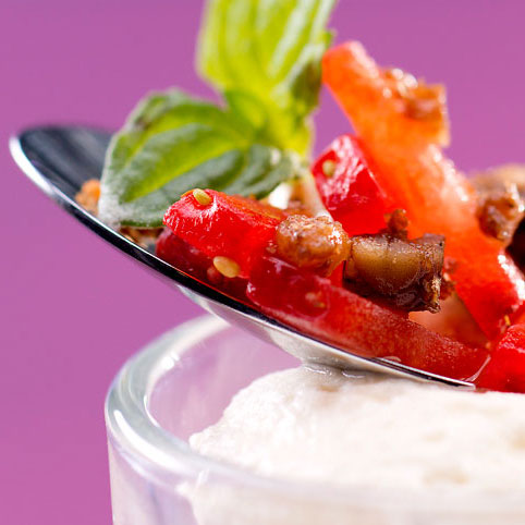 Weiße Schokomousse mit Pumpernickel und marinierten Erdbeeren