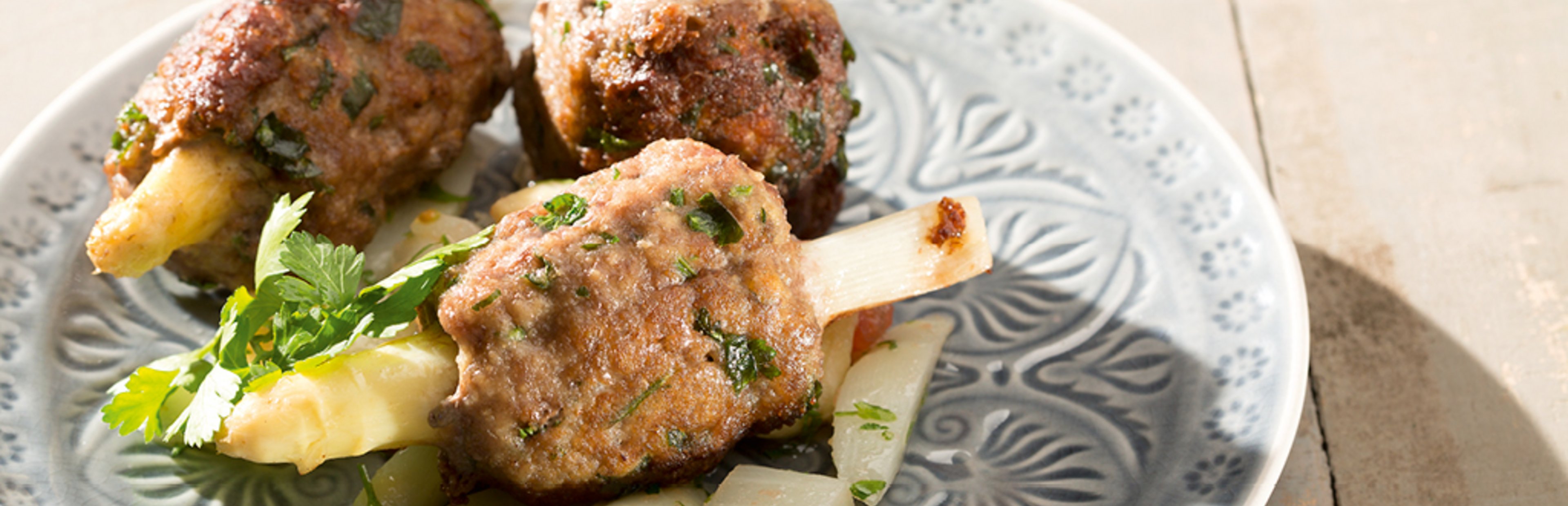 Die Zwiebel fein würfeln, die Möhre fein raspeln und die Blattpetersilie hacken. Mit Hackfleisch, dem Ei, Senf und Paniermehl gut vermengen. Die Hackfleischmasse mit Salz und Pfeffer würzen und daraus 10 kleine, längliche Frikadellen formen. Die Spargelstangen schälen und in Salzwasser mit etwas Butter garen. Anschließend vorsichtig durch die Frikadelle stecken und diese in einer Pfanne mit etwas Fett von allen Seiten schön braun anbraten.