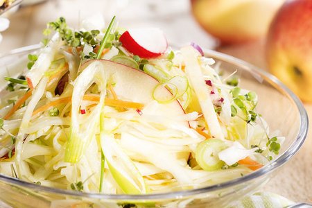 Mediterraner Nudelsalat mit Farfalle, Oliven, Tomaten, Rucola in einer weißen Salatschüssel auf einem Tisch